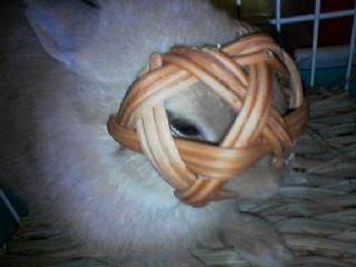2005-05-08 うたた寝マットの付属ボールで… クーちゃん(ウサギ)2005-2011没 先日買い与えた「うたた寝マット」の付属のツルでできたボールなんですが、 早くもほぼ食いつくして、ふと見るとマスクのような形になっていたので、 何気なくクーちゃんの顔につけてみたら 意外にも嫌がる様子がなかったので遊んでみました。