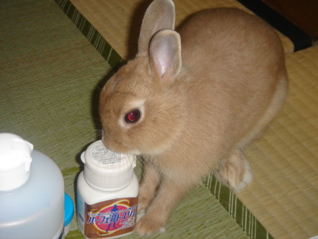 2005-07-28 クーちゃんパーフェクトスリムを目指す クーちゃん(ウサギ)2005-2011没 飼い主が気が向いたときにだけ飲んでる ファンケルの『パーフェクトスリム』に 何故か興味しんしんのクーちゃんです(^_^;)