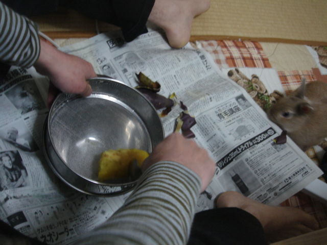 2006-01-03 くーちゃん皮を盗み食いする クーちゃん(ウサギ)2005-2011没 昨日夫にスイートポテトを作らせてた最中のショット お気づきだろうか…くーちゃま密かに焼き芋の皮をつまんでいたのだ…