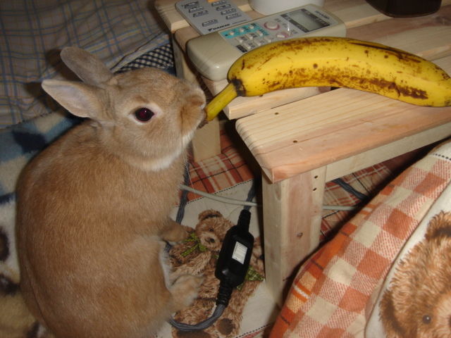 2006-01-26 くーちゃんバナナを発見する クーちゃん(ウサギ)2005-2011没 ある日ボクは室内を散策中に下男の机の上に置いてあった1本のバナナを発見した この家でボクがバナナをもらえるのは週に1度あるかないか程度 そういえばここしばらくバナナを食べてないのだ… これはどういうことなのだ