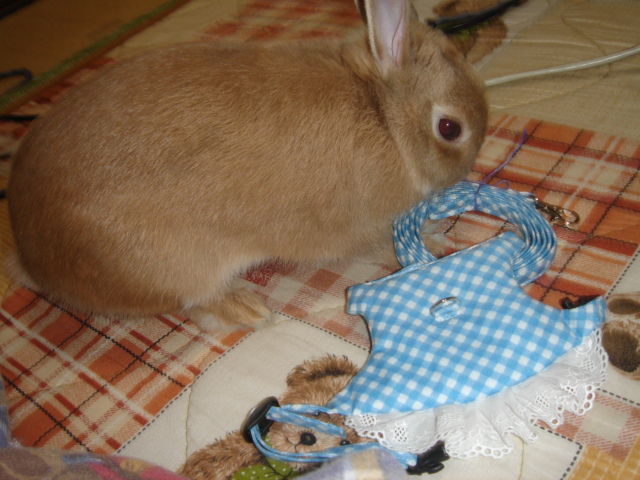 2006-04-13 おにゅーのふりふりを着る クーちゃん(ウサギ)2005-2011没 先日オークションで買ったくーちゃんのおにゅーのベストタイプのハーネス 実は紗倉ちゃんとペアなのだお揃いなのだ!! で、早速くーちゃんに着せてみたんだけど… 例のごとく半狂乱(てか全狂乱)になってベストを脱ごうとして 更に自分で自分を締め付けてゴロゴロ転がりまくって 息も絶え絶えになって死んでしまうかと焦ったのだ… やっぱ室内でなく郊外で装着させないと駄目だなぁ でもふりふりがとってもかわいいのだ~~ お似合いなのだ!!