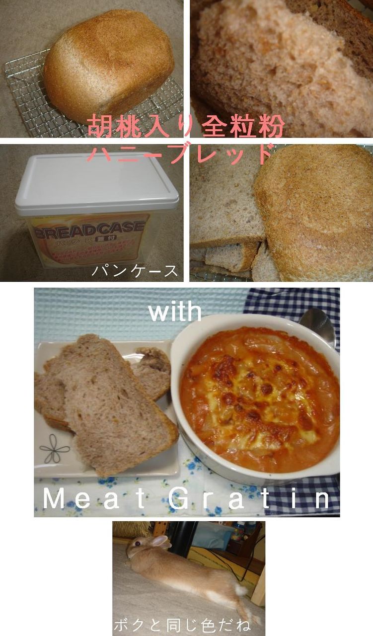 2007-05-01 胡桃入り全粒粉ハニーぱん もぐもぐ日記 クーちゃん(ウサギ)2005-2011没 6回目は日曜日に百均で買ってきた 全粒粉と胡桃ダイスとはちみつを使ったパンを作ってみた。 ヘルシーパンコースはフランスパンと同じく4時間かかった。 ほんのり甘くて香ばしいウスチャイロのとても美味しいパンが焼きあがったのだ~~。 昨日のデナーでミートグラタンと一緒に食べたのだ。 今日はお仕事デーなのに雨…。
